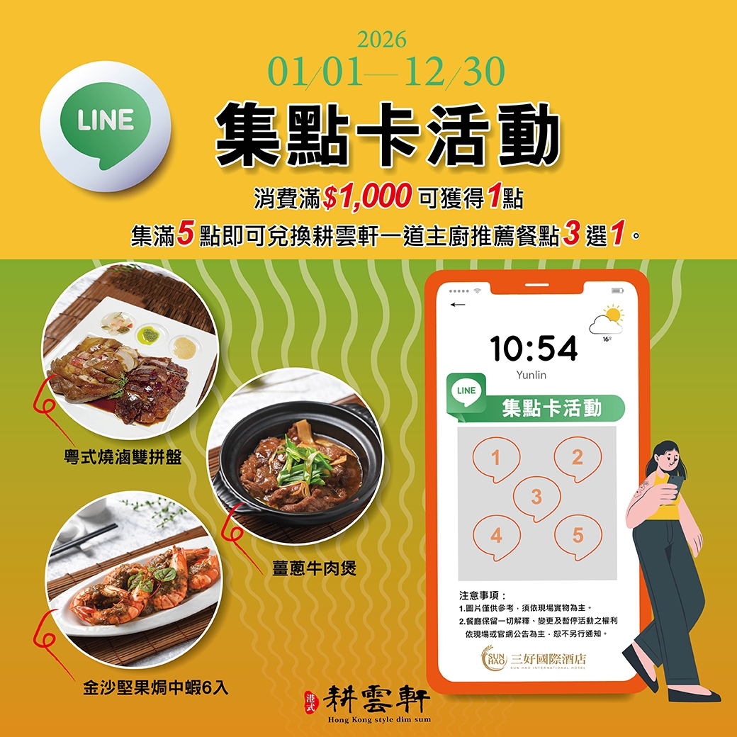 ✨ LINE官方好友專屬|集點禮遇 ✨ 於每一次相聚之中,細細累積對美味的期待。 加入LINE官方好友,凡消費每滿 $1,000元,即可獲得 1點, 讓日常的用餐時光,轉化為一段值得收藏的儀式。活動期間自 2026/03/24 至 2026/12/30 止 詳細資訊