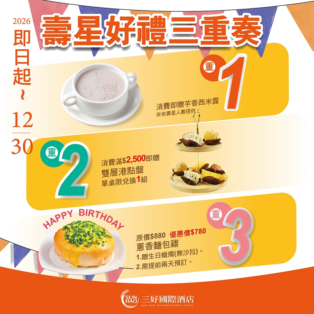 ℍ𝔸ℙℙ𝕐 𝔹𝕀ℝ𝕋ℍ𝔻𝔸𝕐 | 餐廳壽星禮遇・三重奏 在值得紀念的日子裡,為壽星獻上一場專屬的美味饗宴。 三好精心準備三重驚喜,讓歡聚時光更加溫馨難忘。活動期間自 2026/03/24 至 2026/12/30 止 詳細資訊