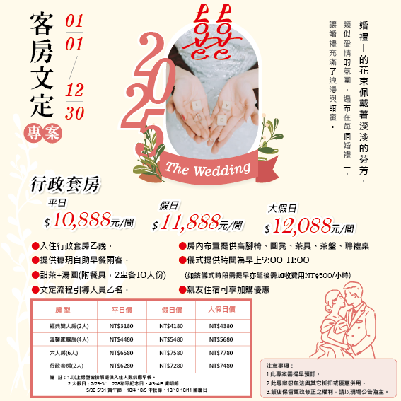 總統套房文定專案 幸福時刻,尊榮享受🥰 每晚只要$19,800,續住每晚$13,800 專人服務📞05-5510999分機3002 3003 或洽宴席中心LINE 👉https://line.me/ti/p/DpsMTyqcYB 或搜尋ID 55109992006 活動期間自 2025/02/22 至 2025/12/30 止 詳細資訊