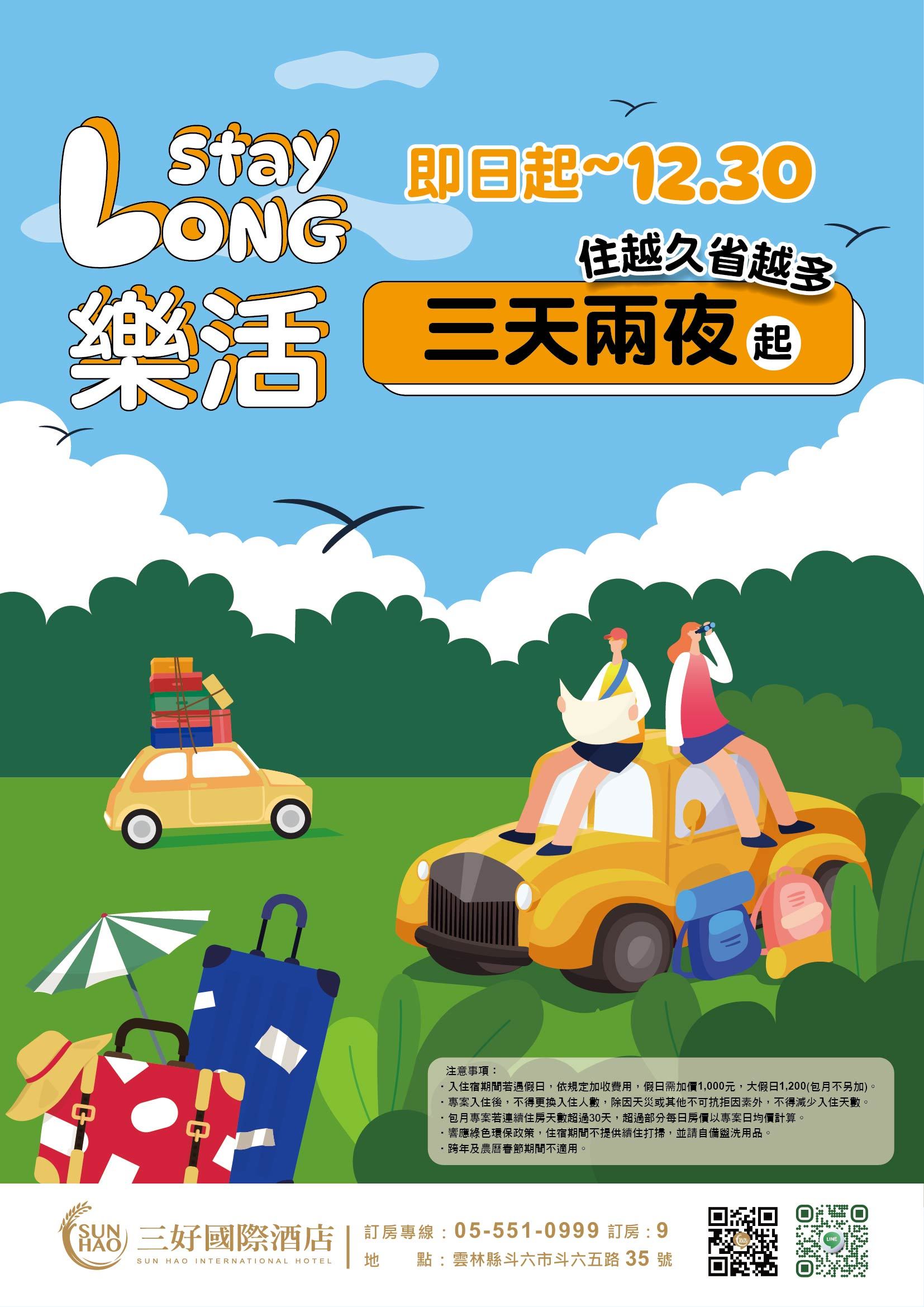 三好國際酒店推出【樂活專案】 從 三天兩夜、四天三夜、五天四夜, 一路延伸到 包月入住方案, 住越久、優惠越多,一整年都替你省更多! 不論是放鬆度假、轉換生活節奏, 還是長期停留的舒心選擇, 都能在這裡找到最剛好的節奏與價格。 📞 歡迎立即來電洽詢 📝預訂專線|三好國際酒店櫃台 05-5510999 #9 📅 活動期間|即日起~2026/12/30 慢慢住、好好過, 樂活,就從今天開始 ✨